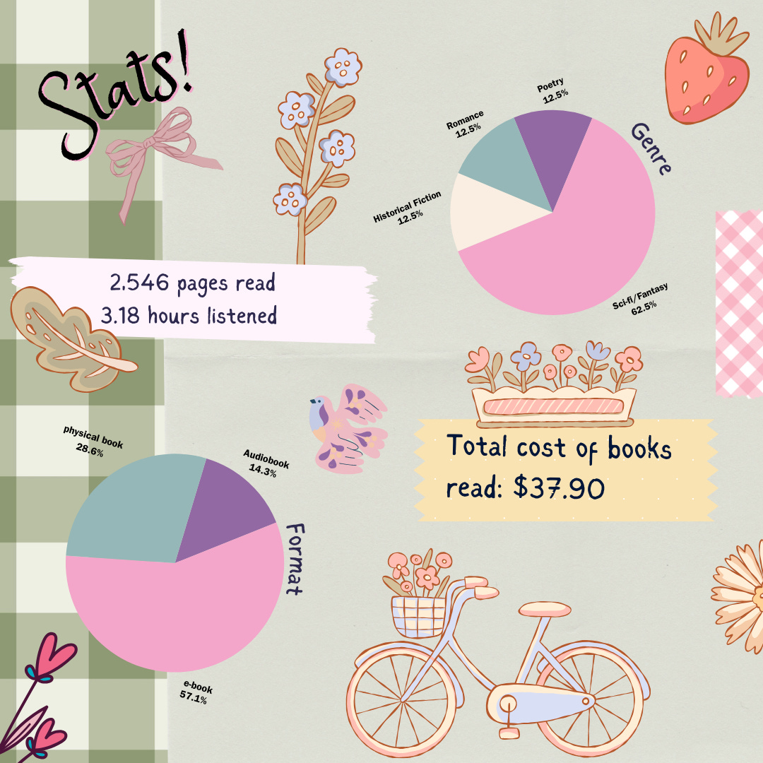 It is clear I am on a Sci-Fi Fantasy kick right now! Overall I am happy with my reading this month. I read multiple 5 star books and was able to keep the cost of my reading under $40, compared to spending over $80 the month before (Thanks Kobo Daily Deals and Libby <3 ).